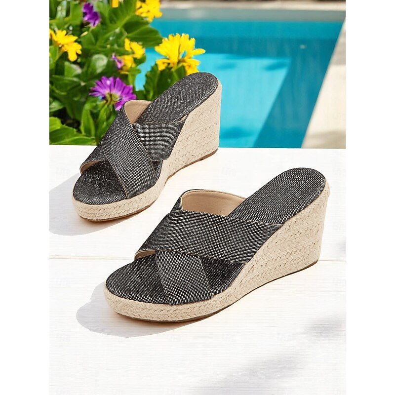Women's Black Glitter Cross-Strap Espadrille Wedge Sandals – Resort-Ready Comfortable Slides for Beach Vacations 1