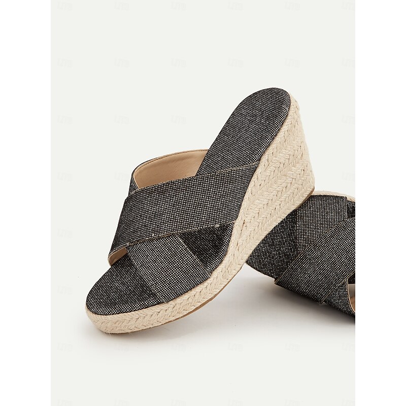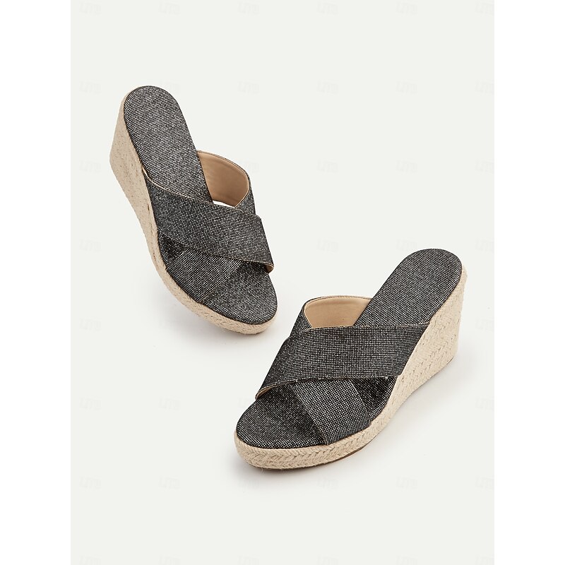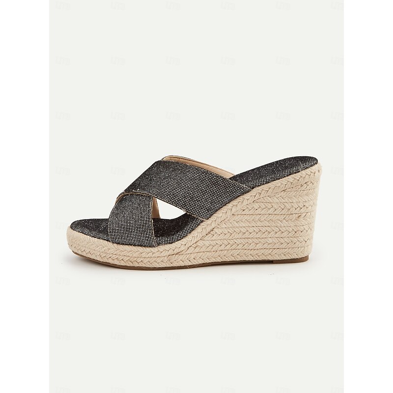 Women's Black Glitter Cross-Strap Espadrille Wedge Sandals – Resort-Ready Comfortable Slides for Beach Vacations 11