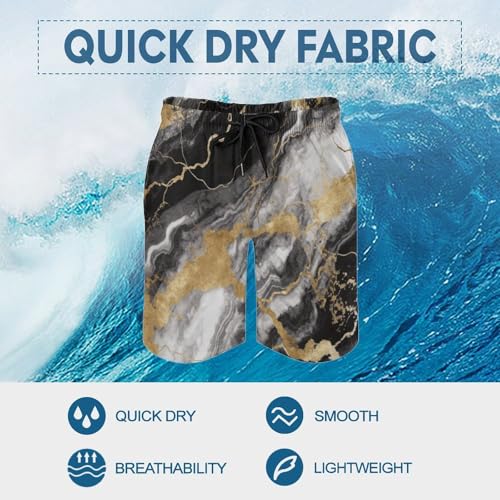 HOT ! Men's Swim Trunks Black White Gold Foil Marble Quick Dry Beach Shorts Mesh Lined Swimming Shorts with Pockets