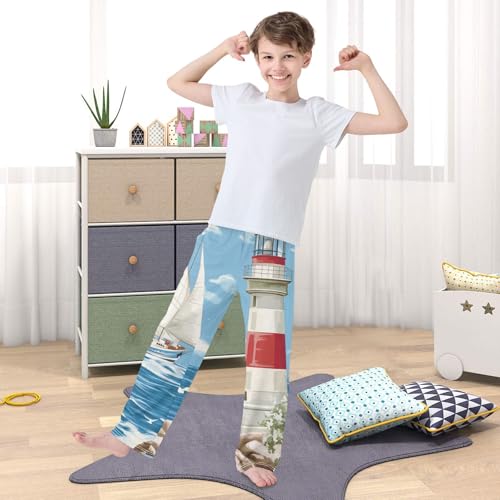 HOT ! ZZXXB Sailboat Lighthouse Oil Painting Boys Long Pants Soft Trousers Elastic Waist Kids Lounge Bottoms with Pockets S-XL