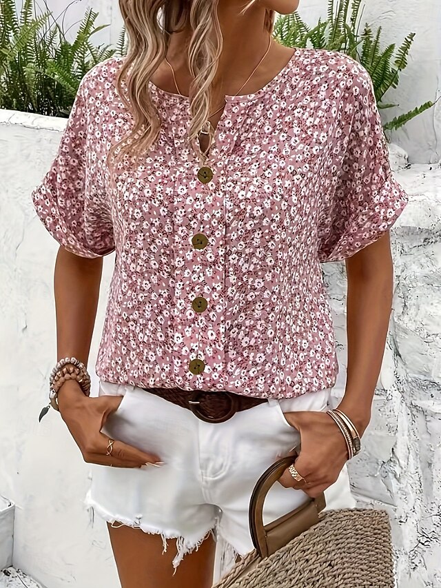 Women's Blouse Button Down Floral Stylish Casual Short Sleeve Crew Neck Regular Tops Daily Buttons Print Pink Navy Blue Orange Summer 13