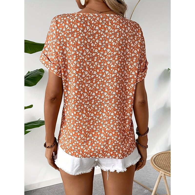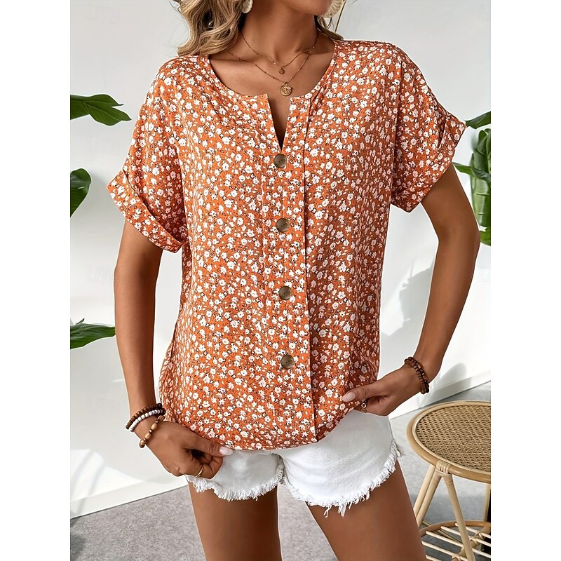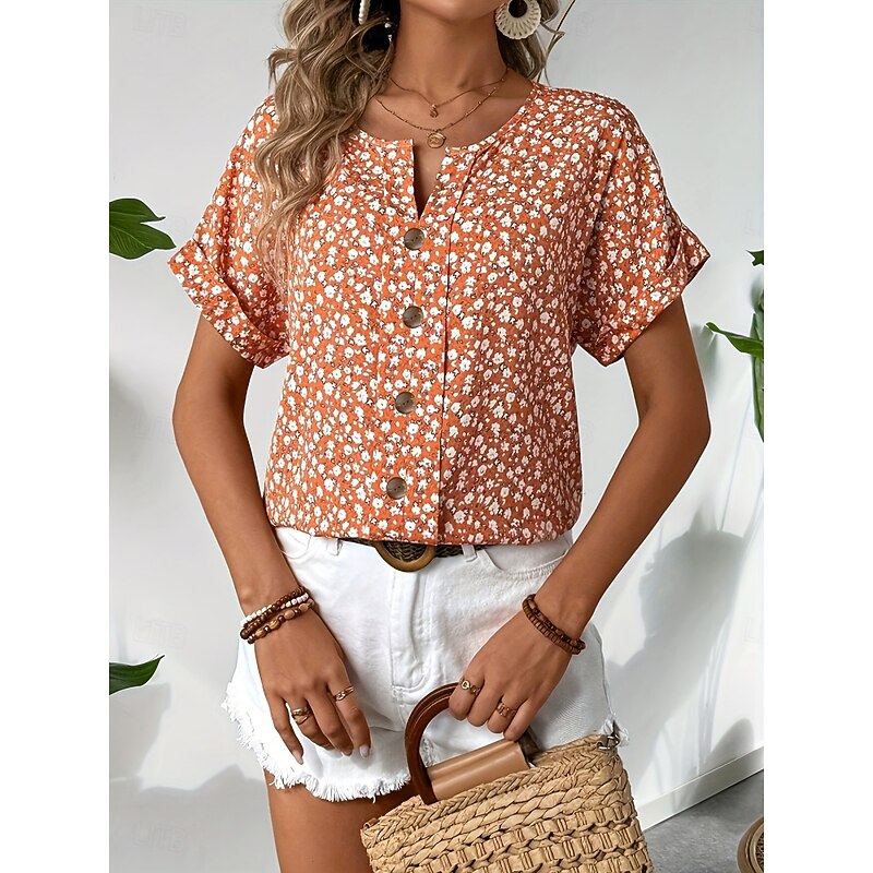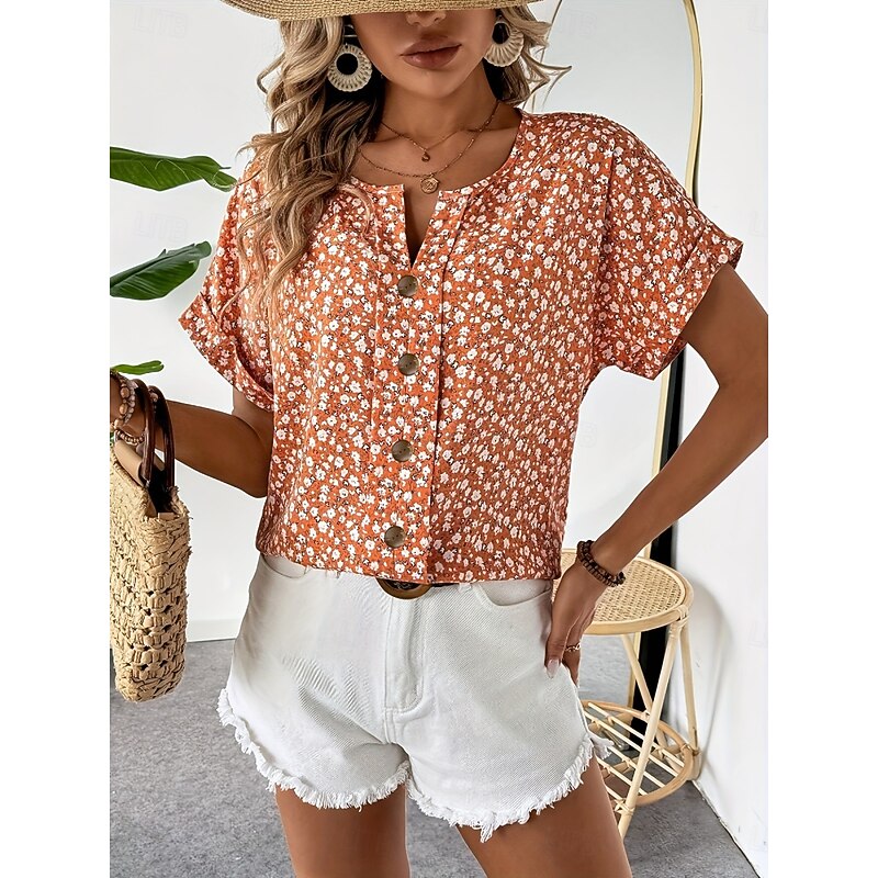 Women's Blouse Button Down Floral Stylish Casual Short Sleeve Crew Neck Regular Tops Daily Buttons Print Pink Navy Blue Orange Summer 9