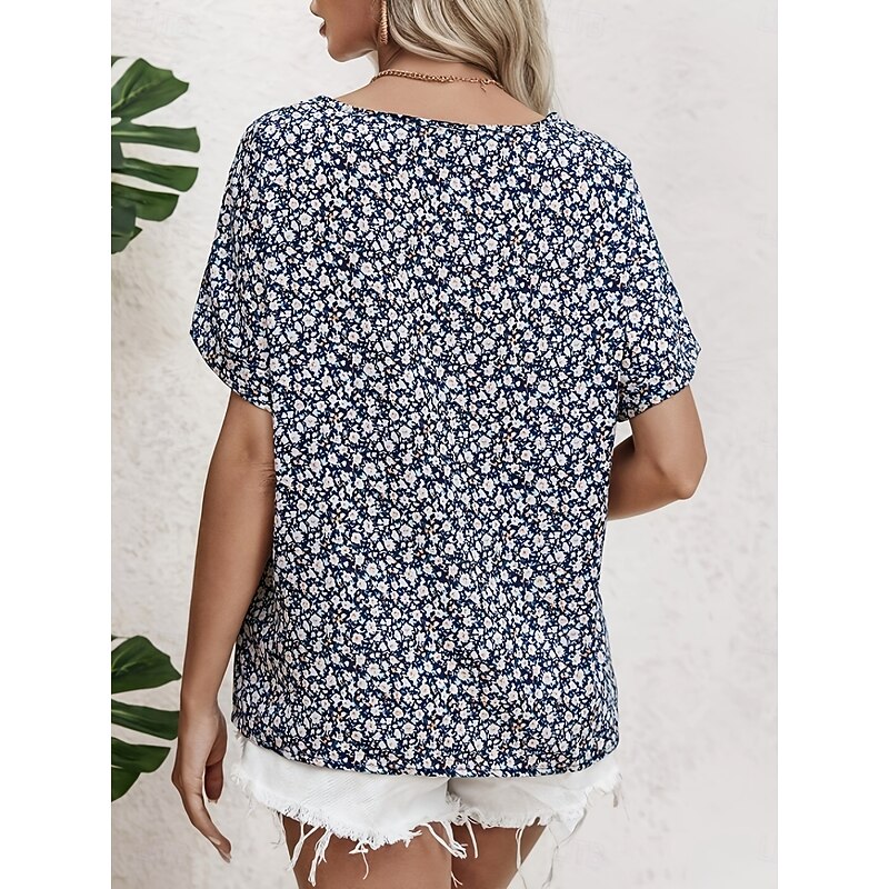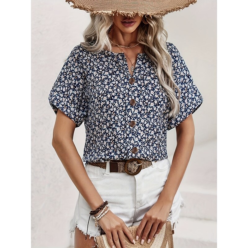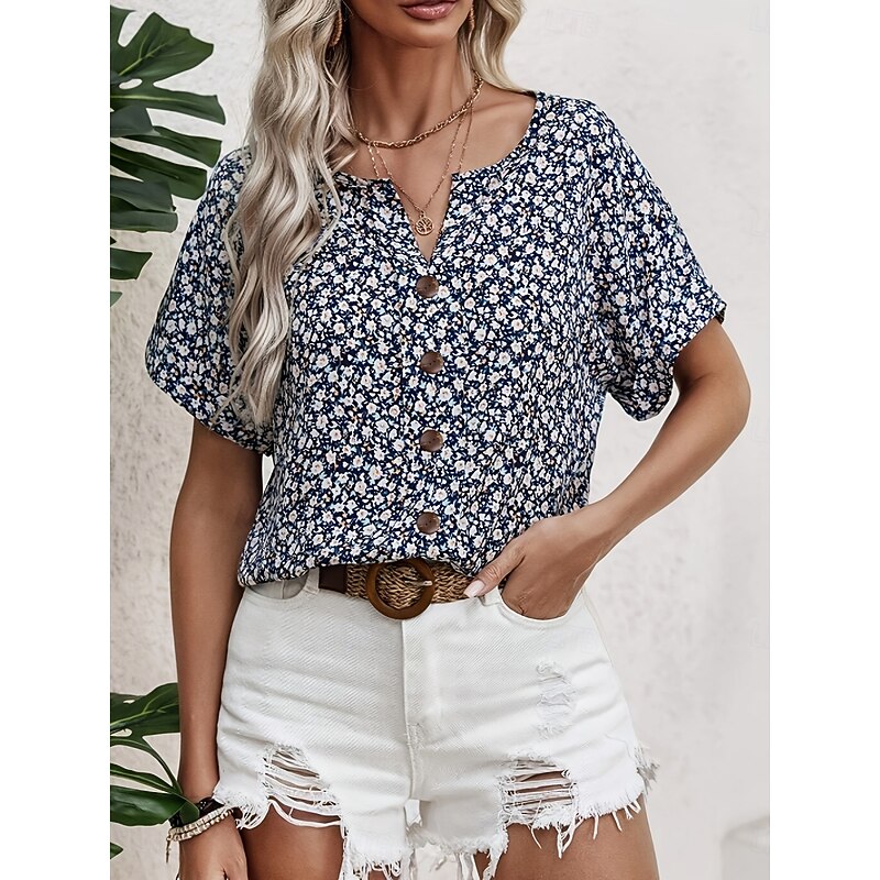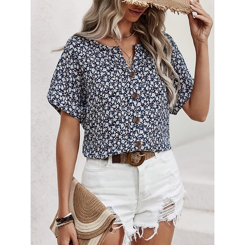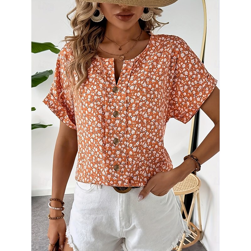 More information about Women's Blouse Button Down Floral Stylish Casual Short Sleeve Crew Neck Regular Tops Daily Buttons Print Pink Navy Blue Orange Summer