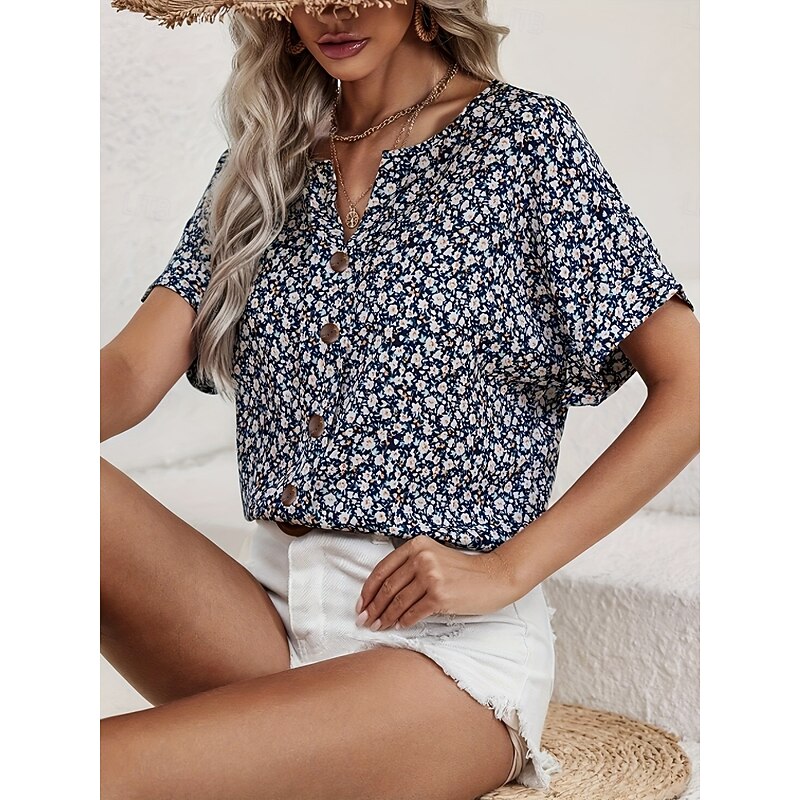 HOT ! Women's Blouse Button Down Floral Stylish Casual Short Sleeve Crew Neck Regular Tops Daily Buttons Print Pink Navy Blue Orange Summer