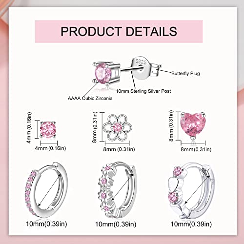 6 Pairs Huggie Hoop Earrings 925 Sterling Silver Stud Sets Cute Heart Hoops Tiny Cubic Zirconia Flower Stud Small Hypoallergenic Cartilage Sleeper Earrings 4