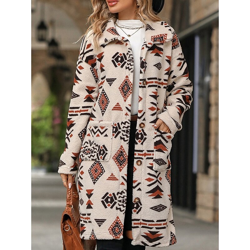 Women's Fleece Jacket Teddy Coat Warm Breathable Buttons Pocket Fleece Lined Vintage Casual Geometric Vacation Street Daily Wear Going out Single Breasted Long Turndown Regular Fit Long Sleeve