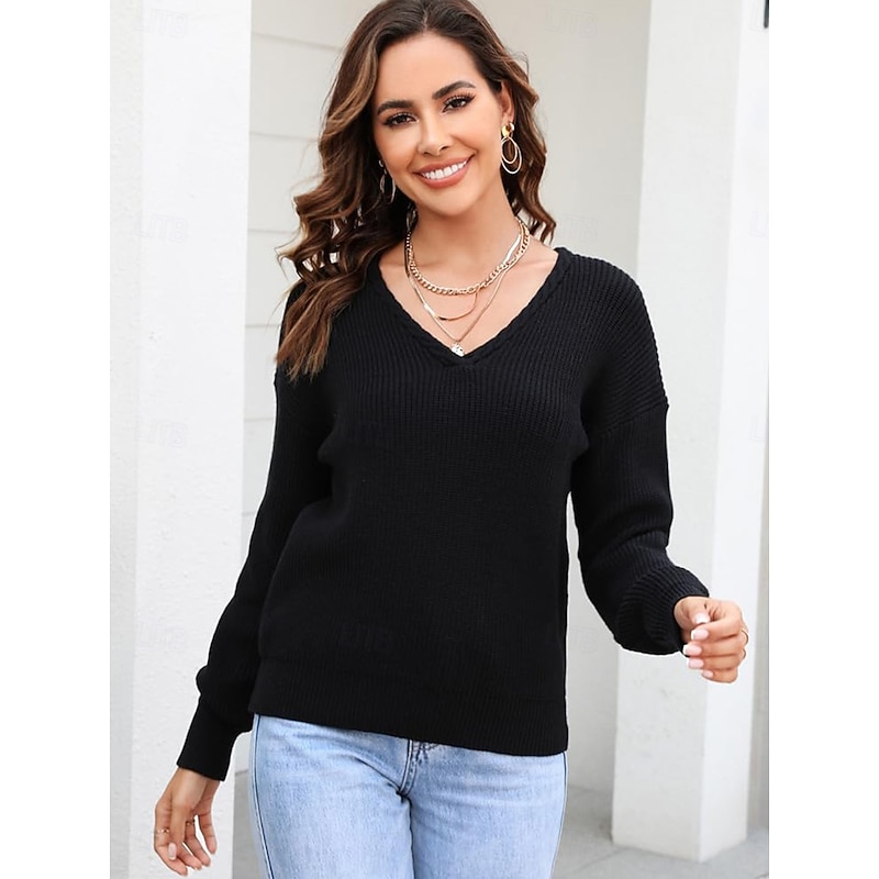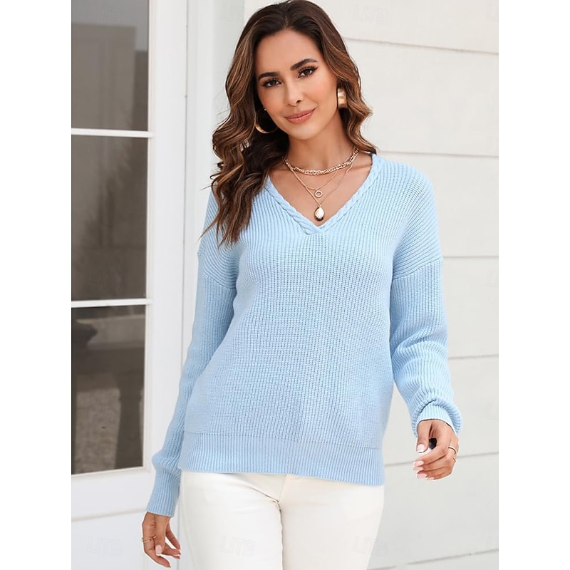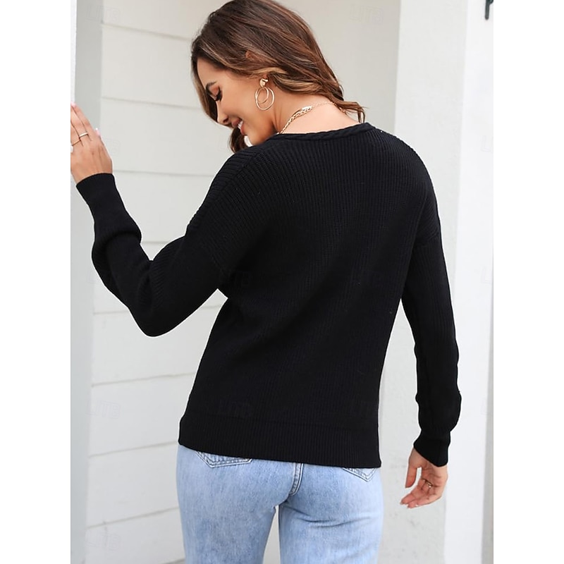 Women's Sweater trendy Solid Color Crochet V Neck Braided Long Sleeve Regular Tops Knit Work Black Pink Spring Fall