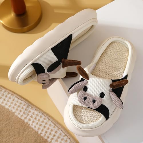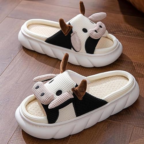 Sole material: Ethylene Vinyl AcetateOuter material: CottonClosure type: Pull OnCute and Eye-catching Shape Design: The shape design of this cotton slippers is the appearance of a cartoon cow, a realistic cow image, cute horns and ears, and a bull nose, which are very smart and cute.Good Breathability: The insole of these at-home shoes features sturdy high-density memory foam to relax your feet after a long day of walking.High Quality Sole: Cartoon Cow Slippers are made of high quality material - EVA, which is strong and durable, lightweight, non-slip, and easy to clean. Therefore, Cartoon Cow Slippers are very lightweight as a whole, not tired, and the sole is not only non-slip but also wear-resistant, and it is not easy to deform after long-term wear. The thickness of the sole is about 2.5cm, and the side seams of the thick sole make it more difficult for the sole to get wet.Comfortable Foot Feel: The slippers are very comfortable on the feet, so people feel very comfortable and relaxed.Interesting Gift: The image design of the cartoon cow is full of cute and humorous childishness.It can be used as a gift for your sisters to have this cuteness together.
