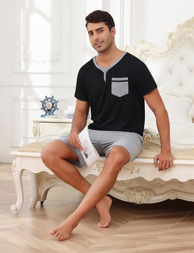 Fabric type: 95% Cotton, 5% SpandexOrigin: ImportedSoft & Breathable Fabric: Made from 95% cotton and 5% spandex, this men’s short pajama set is lightweight, breathable, and ultra-soft, ensuring a comfortable sleep and lounging experienceClassic Henley Top & Adjustable Shorts: Featuring a short-sleeve Henley V-neck top and elastic waist shorts with a functional drawstring, this men’s sleepwear set offers a perfect customized fitRelaxed Fit for All Seasons: Designed for year-round comfort, this men’s loungewear set provides a relaxed, roomy fit, making it ideal for sleeping, lounging, or casual wear at homeConvenient Side Pockets: Equipped with two invisible side pockets, these men’s pajama shorts offer ample space to carry essentials like your phone or wallet when neededPerfect Gift for Any Occasion: This men’s pajama short set makes a thoughtful gift for Father’s Day, birthdays, anniversaries, vacations, Valentine’s Day, and more—order now for a sleek and cozy sleepwear upgrade