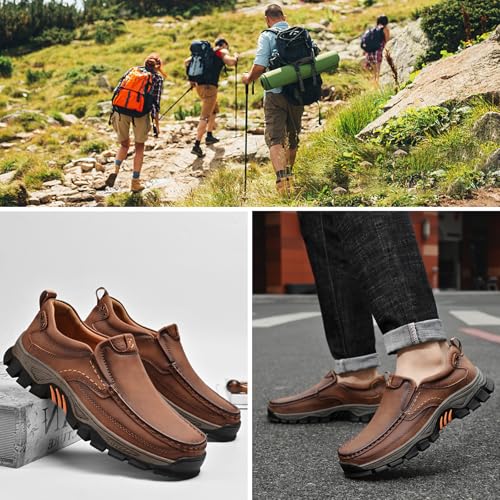 Sole material: RubberOuter material: snug soft leatherClosure type: Pull-OnPremium Fabric: The mens vintage loafers are made of comfortable soft leather material, with excellent air permeability, adding the sense of texture and prolonging the durabilityNon Slip Sole: The men hiking shoes sole is made of anti-skid and wear-resistant rubber, with long-lasting durability and adequate grip.It can provide a good anti-slip effect whether indoor or outdoor, and has strong stabilitySlip-on Design: Slip on Hands loafers allows you to quickly put on and take off the shoes just one second. It can provide better foot comfort when walking or exercisingEasy To Put on Take Off: Slip on your lace-free casual walking loafers and be ready to go in seconds. A slip-on design eliminates the hassle of straps or laces for maximized convenience, comfortApplicable Occasions: Designed for daily work and outdoor sports, such as hiking, walking, camping, mountaineering, cycling, fishing, backpacking, hiking, climbing, traveling, etc Perfect for everyday use. superior materials and excellent craftsmanship ensure long-lasting durability.