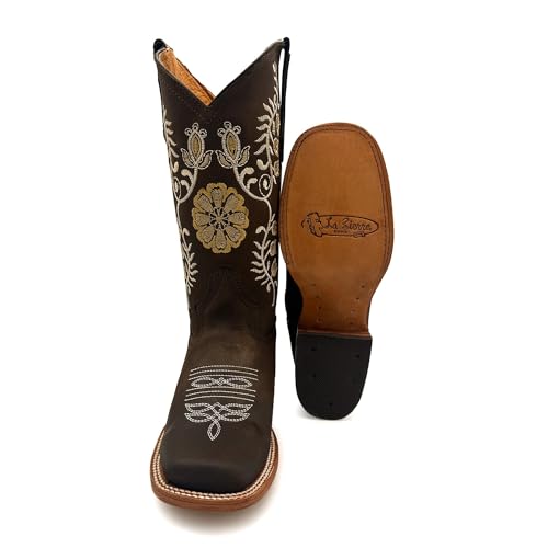 Women’s Genuine Leather Brown Square Toe Western Floral Embroidered Cowgirl Boots Mid Calf 6