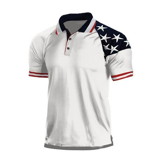Highlights [Fabric] : Crafted from a breathable cotton blend, this men's star polo shirt ensures comfort and durability for warm weather. The lightweight material offers a micro-elastic fit, making it ideal for spring and summer wear. [Fit Type] : Featuring a regular fit, this polo shirt allows for easy movement, perfect for various activities, whether it's a casual outing or a sporting event. [Design Highlights] : This polo shirt boasts a modern and patriotic design, with a contrasting navy blue panel and white star patterns on one shoulder for a bold look. The collar and sleeve cuffs are accented with red and navy blue stripes, adding sophistication. The classic button-down placket complements the contemporary style, while the turndown neckline enhances its fashionable appeal. [Occasions] : Suitable for street, holiday, daily, beach, and weekend occasions, this versatile shirt adds a touch of elegance and style, whether you're at a casual gathering or enjoying a day out. [Size Range] : Available in sizes S, M, L, XL, 2XL, and 3XL, this polo shirt caters to a variety of body types, ensuring a comfortable and proper fit.