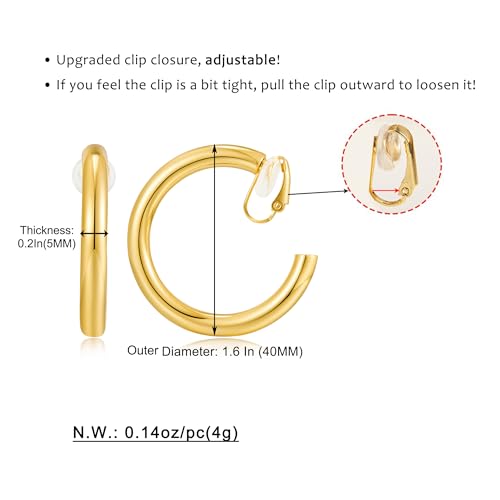 • Non-Pierced Hoop Earrings for Women: The top of the 40mm large hoop clip on earrings is a spring clip closure design and has soft non-slip pads, so people who don't have pierced ears can also enjoy wearing the fashionable gold hoop earrings.