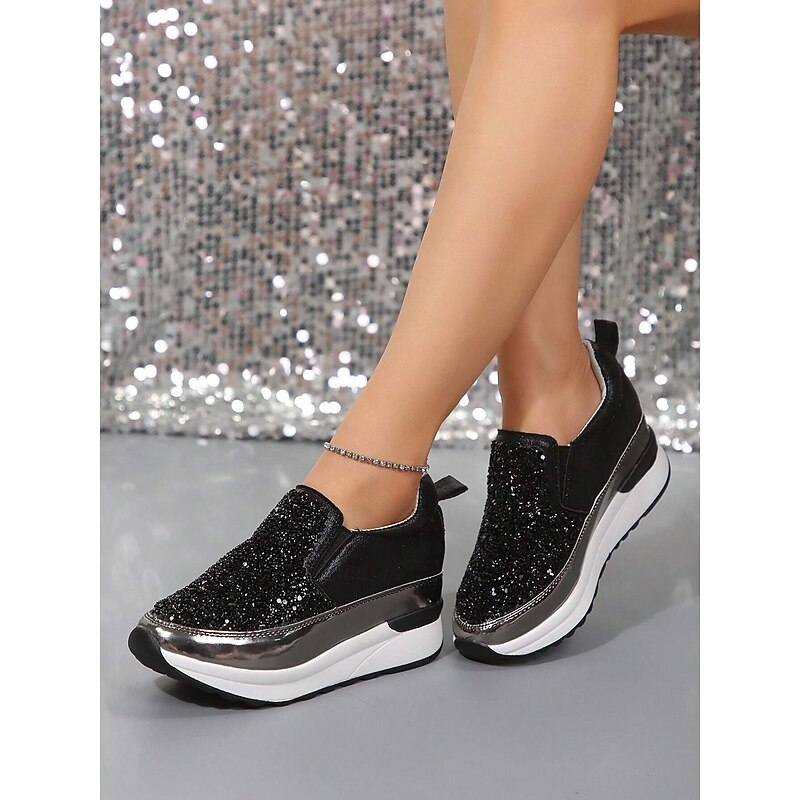HOT ! Women's Black Slip-On Sneakers with Glitter Embellishments and Platform Sole – Stylish Casual Shoes for Everyday Wear