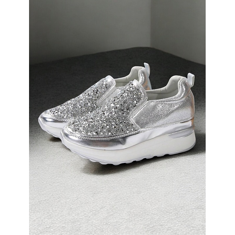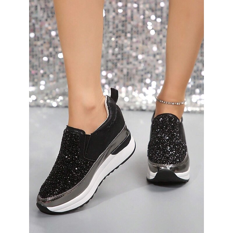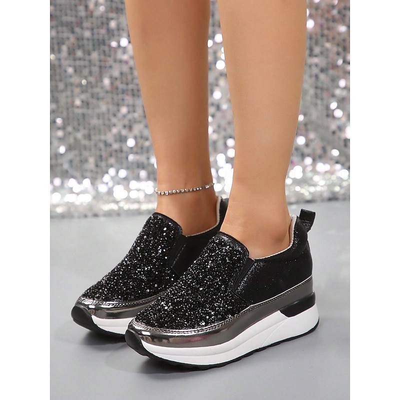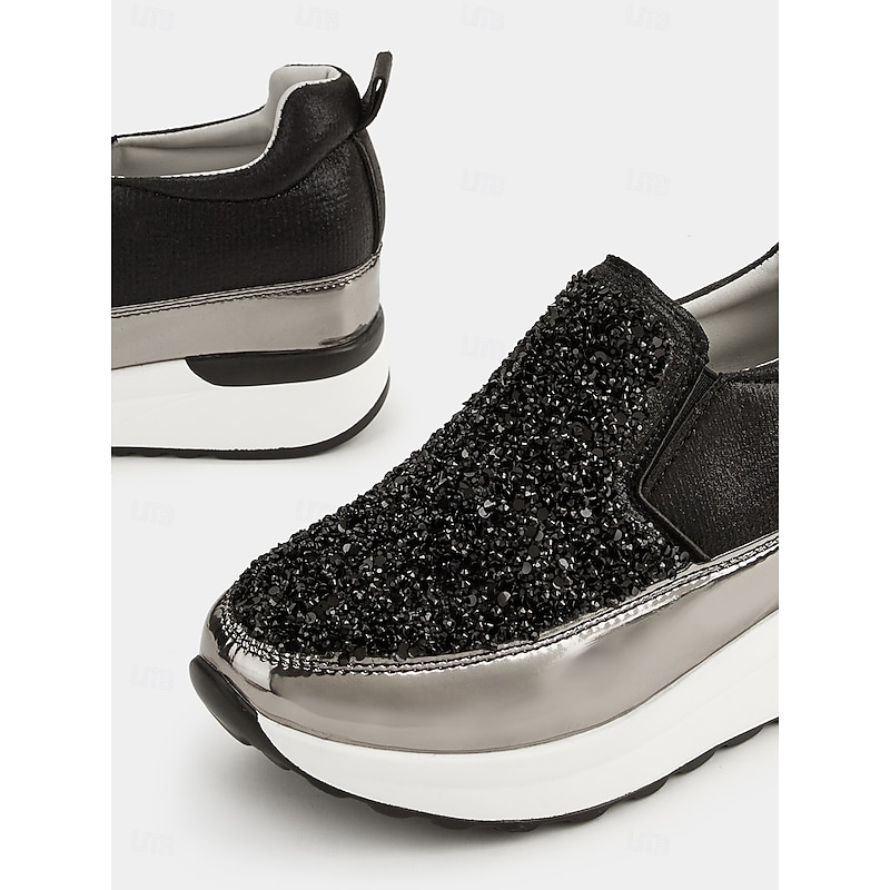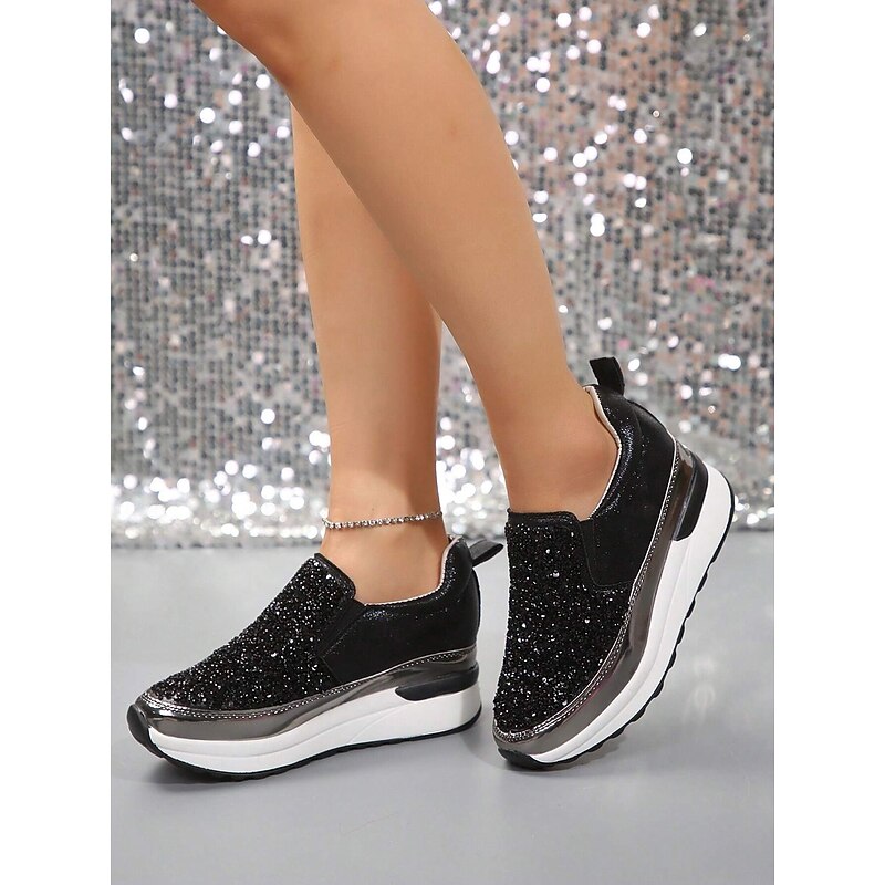 Highlights [Fabric] Crafted from premium faux leather, these sneakers provide a luxurious yet durable touch, perfectly balancing style and practicality. The upper material is adorned with brilliantly shimmering rhinestones, ensuring a chic and attention-grabbing look. [Silhouette] The platform heel design not only elevates your height but also your style, offering a contemporary touch to a classic slip-on silhouette. The round toe shape and padded collar ensure maximum comfort for all-day wear. [Design Highlights] Featuring a sleek slip-on design, these sneakers are both fashionable and convenient, making them ideal for quick wear. The metallic accent on the midsole adds a sophisticated edge, while the glitter embellishments ensure you stand out in any crowd with their sparkling allure. [Occasions] Perfect for daily activities such as walking, these slip-ons seamlessly blend fashion with function. Whether you're running errands or enjoying a casual day out, these sneakers add a touch of glamour to any outfit, enhancing your effortless style. [Sizes Available] These women's sneakers are available in a range of US sizes from 5.5 to 10.5, ensuring a perfect fit for every wearer. This wide range offers flexibility, making them suitable for various foot shapes and sizes.
