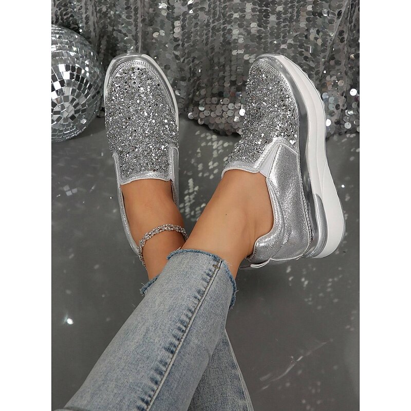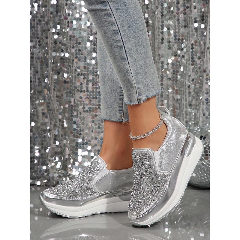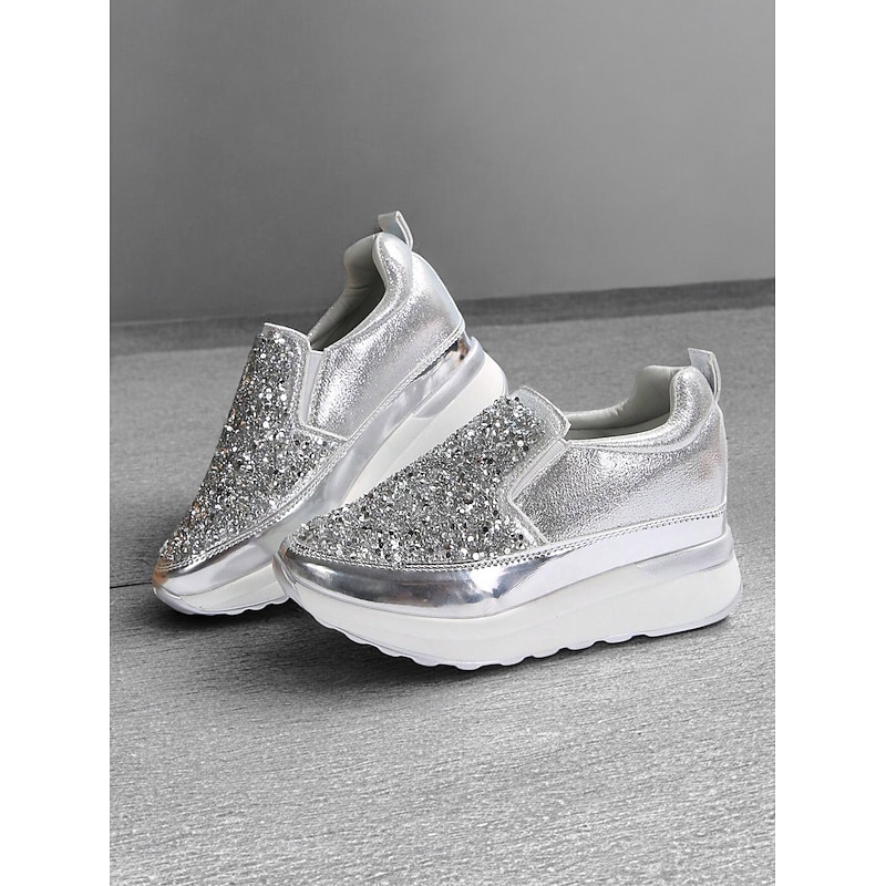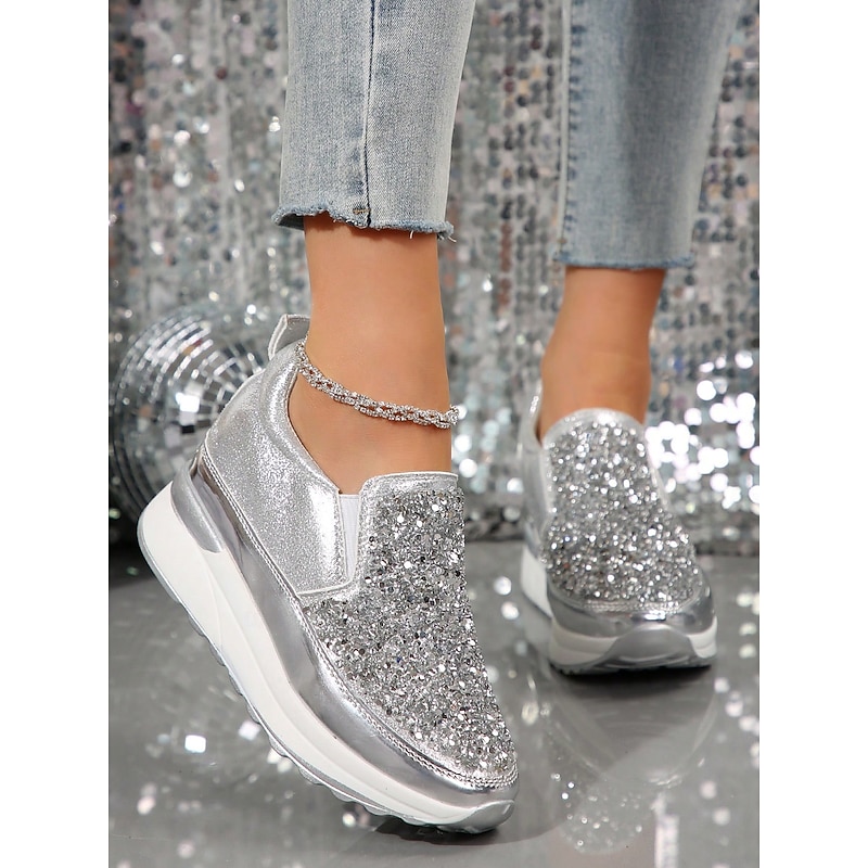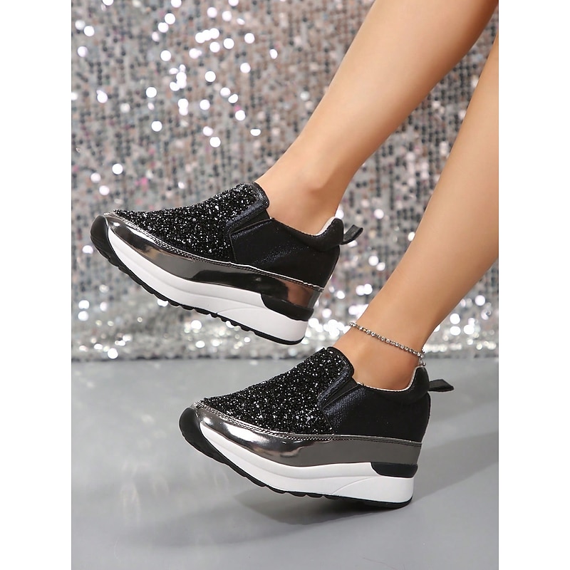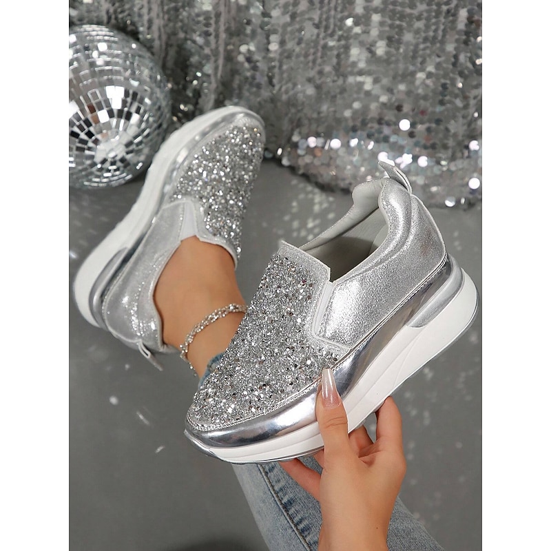 Highlights [Fabric] Crafted from premium faux leather, these sneakers provide a luxurious yet durable touch, perfectly balancing style and practicality. The upper material is adorned with brilliantly shimmering rhinestones, ensuring a chic and attention-grabbing look. [Silhouette] The platform heel design not only elevates your height but also your style, offering a contemporary touch to a classic slip-on silhouette. The round toe shape and padded collar ensure maximum comfort for all-day wear. [Design Highlights] Featuring a sleek slip-on design, these sneakers are both fashionable and convenient, making them ideal for quick wear. The metallic accent on the midsole adds a sophisticated edge, while the glitter embellishments ensure you stand out in any crowd with their sparkling allure. [Occasions] Perfect for daily activities such as walking, these slip-ons seamlessly blend fashion with function. Whether you're running errands or enjoying a casual day out, these sneakers add a touch of glamour to any outfit, enhancing your effortless style. [Sizes Available] These women's sneakers are available in a range of US sizes from 5.5 to 10.5, ensuring a perfect fit for every wearer. This wide range offers flexibility, making them suitable for various foot shapes and sizes.