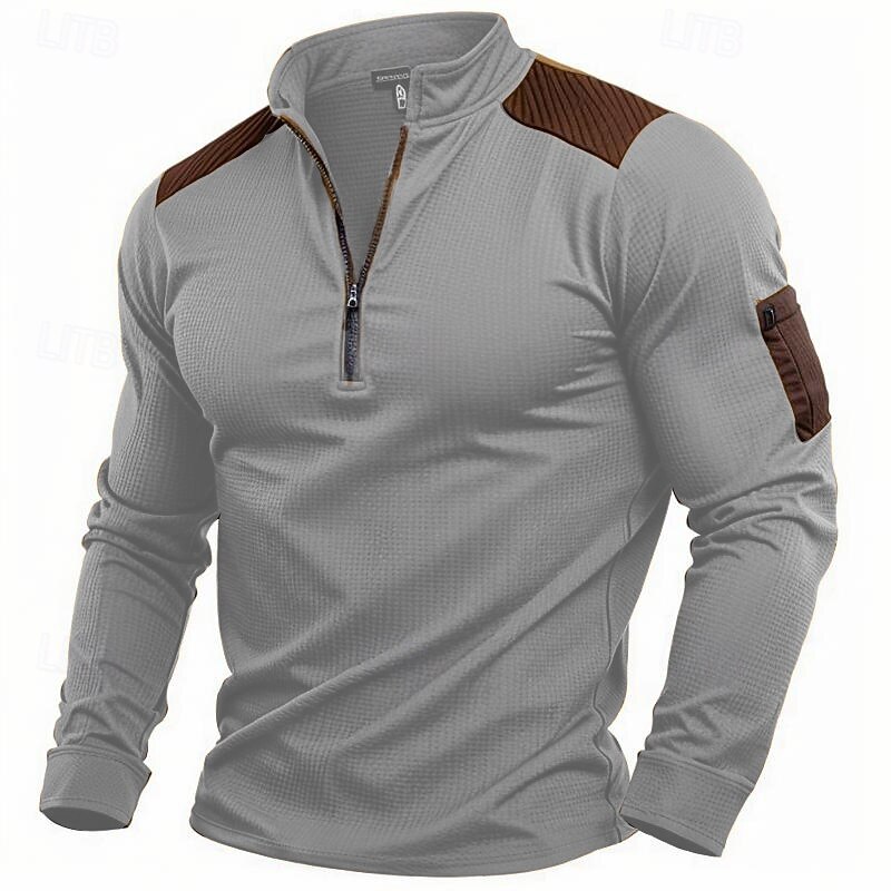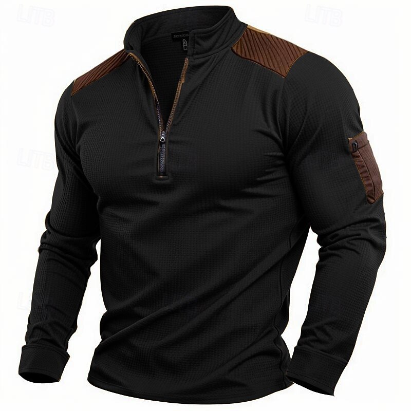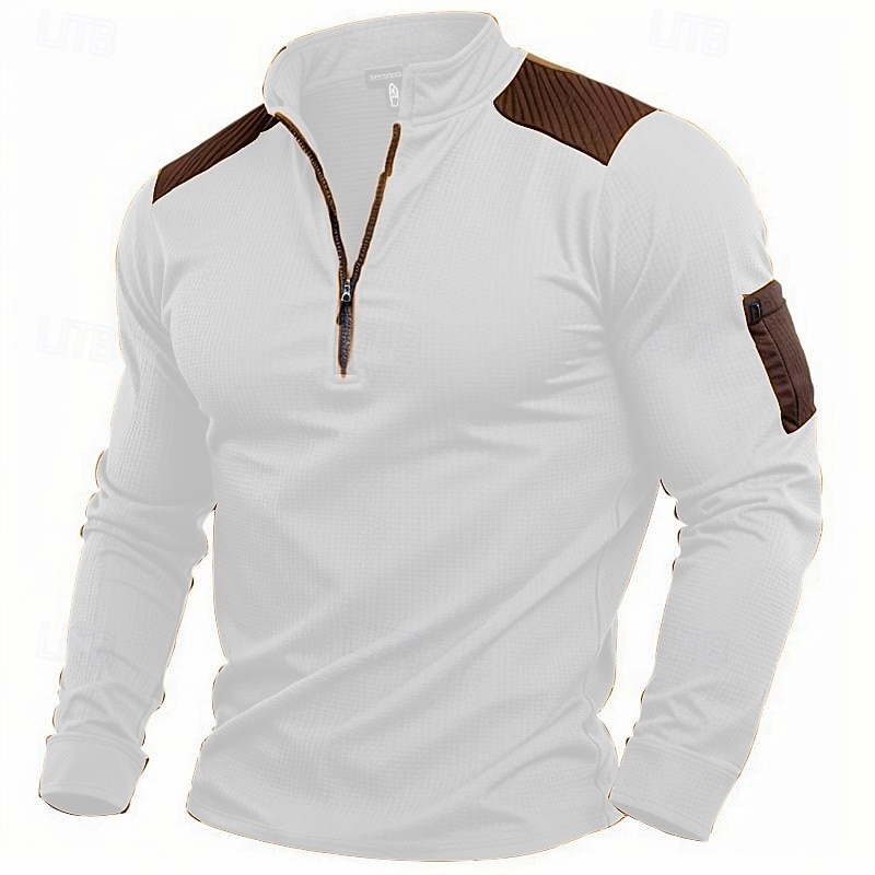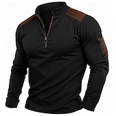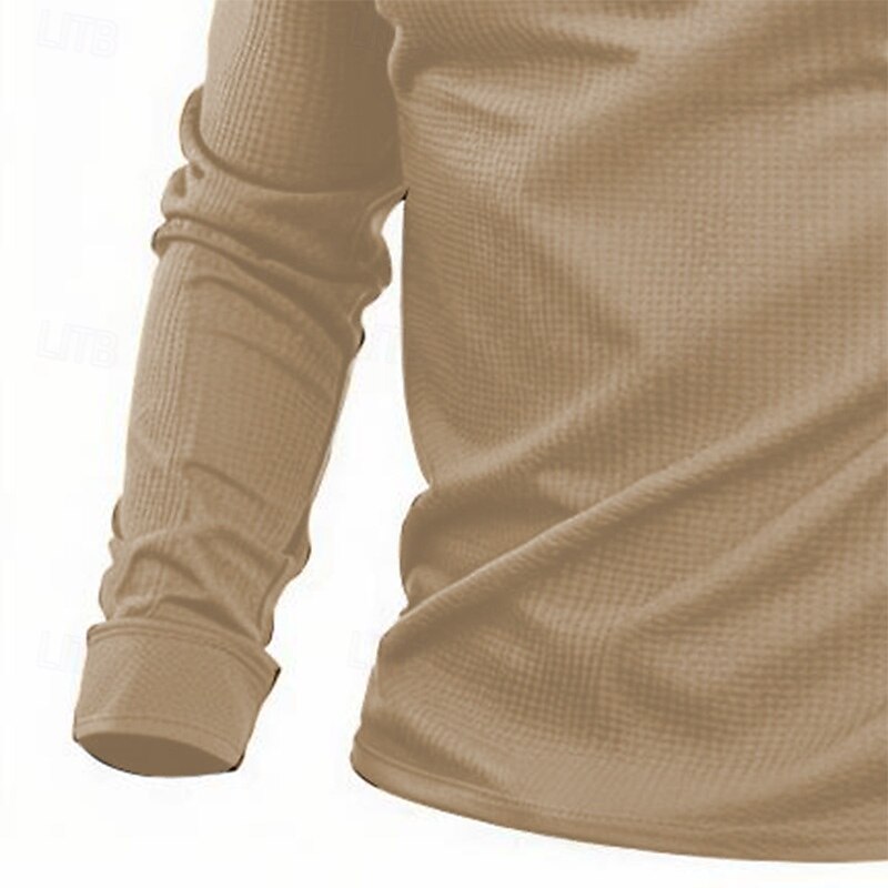 Highlights [Fabric and Material] : Crafted from high-quality waffle knit fabric, this men's T-shirt offers a perfect blend of polyester and cotton for softness and durability. The fabric is breathable and micro-elastic, providing comfort and flexibility for both casual and outdoor activities. [Fit and Style] : Designed with a regular fit, this vintage-inspired knitwear piece features a stand collar with a quarter-zip closure, allowing for adjustable ventilation. The solid color design and classic fit ensure it complements various body types, creating a flattering silhouette. [Design Highlights] : The shirt incorporates modern patchwork elements with reinforced contrasting fabric on the shoulder sections for added style and durability. It also includes a practical pocket on the left sleeve to conveniently secure small essentials, enhancing its functional appeal. [Occasions] : Suitable for a range of occasions from casual daily wear to outdoor adventures, this T-shirt blends practicality with vintage charm. Whether you're engaging in athleisure activities or simply enjoying a laid-back day, it's a versatile addition to any wardrobe. [Size Range] : Available in sizes S, M, L, XL, XXL, and XXXL, this T-shirt caters to a wide range of body types, ensuring a comfortable and personalized fit for everyone.