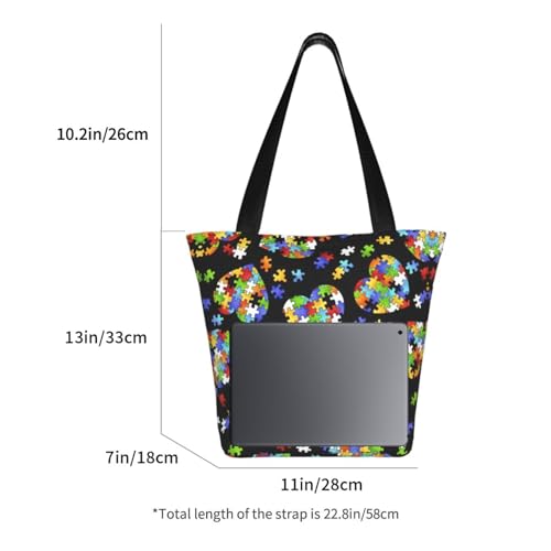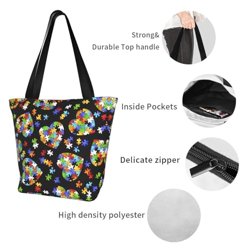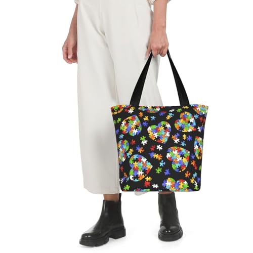 HOT ! Autism Awareness Puzzle Pieces Heart Print Tote Bag For Women, Reusable Large Ladies Shoulder Bag Large Capacity Shopping Totes Fasion Handbag For Office, Shopping, Travel