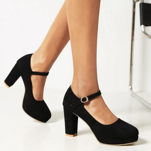 Women's Chunky High Heels Pumps Shoes Round Toe Platform Suede Buckle Strap Mary Jane Dressy Shoe