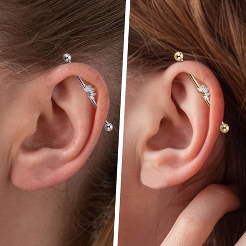 • Industrial Piercing Size and Color: Color: Gold with clear CZ. Size: 14 Gauge(1.6 mm), Bar Length: 1 1/2" (38 mm), Ball Size: 5 mm.