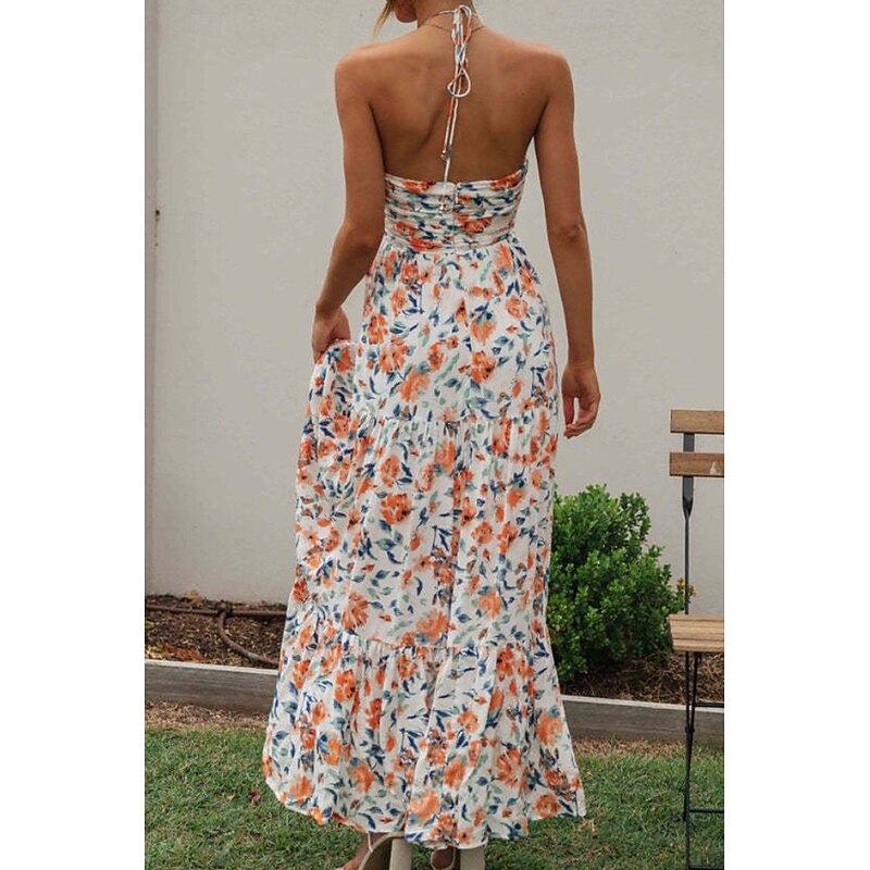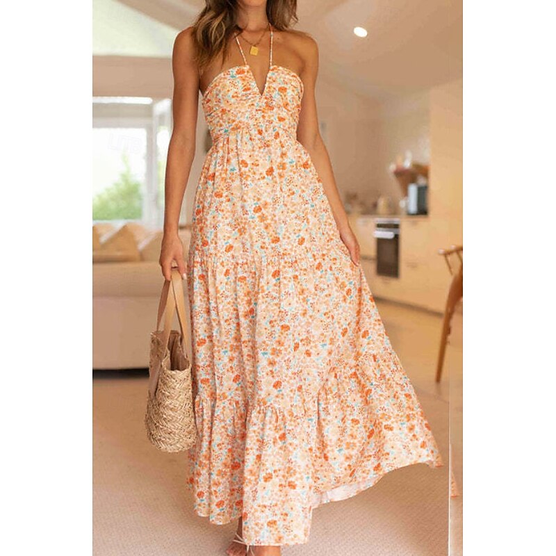 HOT ! Women's Midi Dress Graduation Dress Floral Dress Fashion Outdoor Vacation Holiday Regular Fit Flower Sleeveless Halter Neck Red Blue Orange Summer