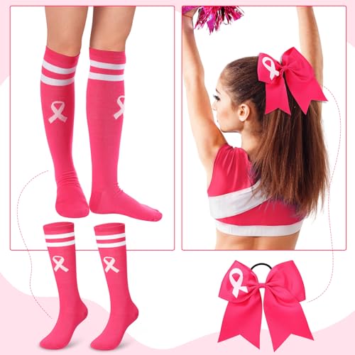 Zoooyawn Breast Cancer Socks Bows Set for Cheerleader, Pink Cheer Awareness Socks Cheerleader Bows Gifts