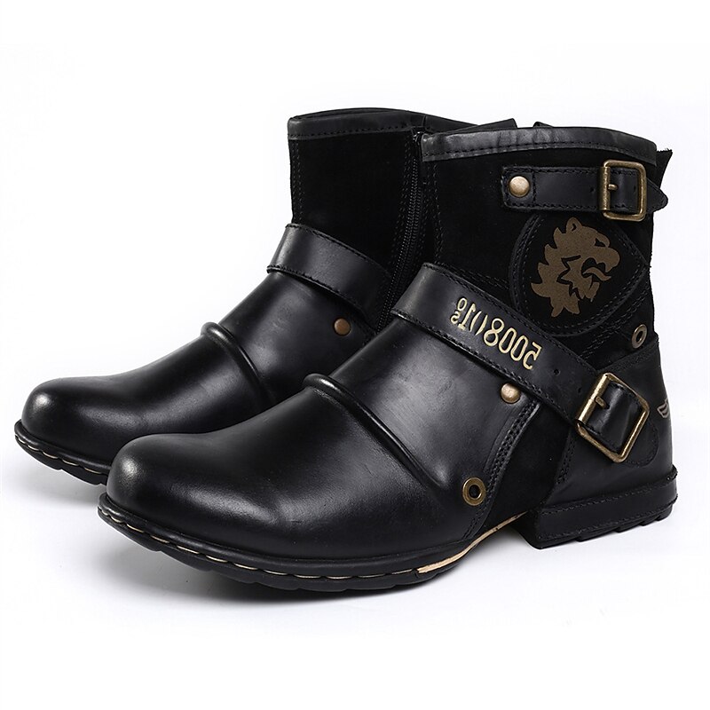 HOT ! Men's Brown Suede Biker Ankle Boots with Buckle Straps and Lion Emblem – Retro Steampunk Cosplay Boots for Halloween, Parties, and Daily Wear