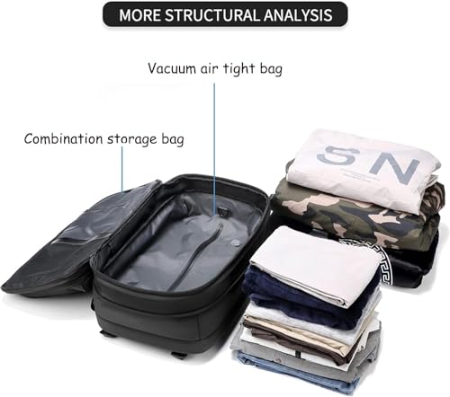 【Large Capacity For Wet And Dry Separation】 Features multiple compartments and a dry/wet separation pocket.Expandable with vacuum compression to a capacity of up to 60 liters, equivalent to a 24-inch rolling suitcase. Yet, its dimensions are only 12 * 7.8 * 20in.【exceptional Safety Design】The main compartment features an anti-theft password lock, and there's a hidden zipper pocket on the back to safeguard your valuables from theft.The perfect size to comply with airline carry-on regulations.【Vacuum Backpack Travel】You can choose our electric vacuum pump for rapid compression or manually press to release air, reducing wasted space between luggage expansion vacuum bags.Built-in vacuum compression system can compress items to one-fifth of their original size, making it is easy to carry more items and enjoy your trip.【Multifunctional Backpack】Ideal as a student backpack, weekend travel backpack, airplane carry-on backpack, professional business backpack, outdoor sports backpack, hiking backpack, it is the perfect gift for travelers.【top-grade Material】Made of high-quality waterproof Oxford cloth and PU leather, PFC-free, waterproof, abrasion-proof, and waterproof vapor, ensuring durability in various environments.