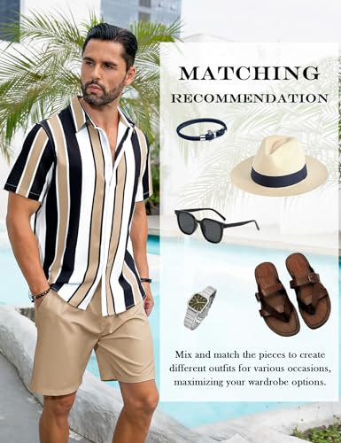 • Tropical Style 2 Piece Outfits: With its classic striped design and contemporary cut, the mens vacation outfit exudes effortless style. Hawaiian vertical striped shirt features short sleeve, button down closure, lapel collar. Casual beach shorts features elastic waist drawstring and 2 side pockets for storing your phone, keys, and other belongings.