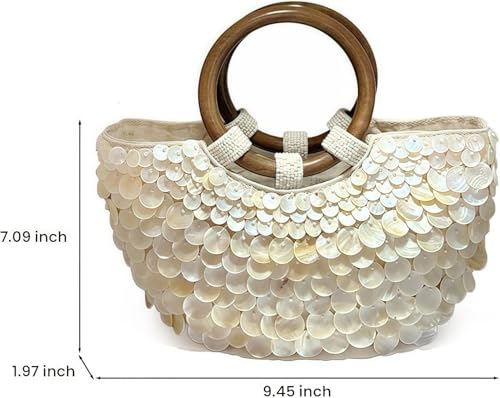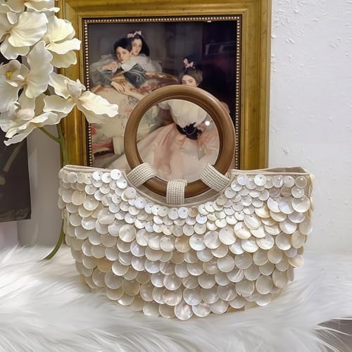 • [Stylish and unique style] This shell purse,seashell purse is presented in a half-moon shape, made of acrylic imitation mother-of-pearl material, giving off a unique texture. With a double round wooden handle at the top, beaded purse skillfully combines the exquisiteness of pearls with the casualness of beach style, and beaded bag shows a different fashion charm.