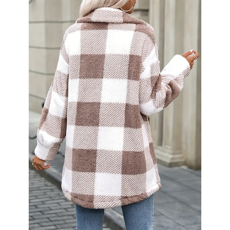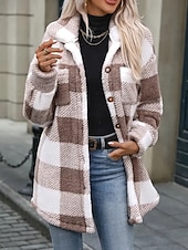More information about Women's Sherpa Jacket Comfortable Breathable Buttons Elegant Casual Plaid Vacation Street Casual Daily Wear Single Breasted Regular Turndown Regular Fit Long Sleeve Outerwear Black Khaki Spring Fall
