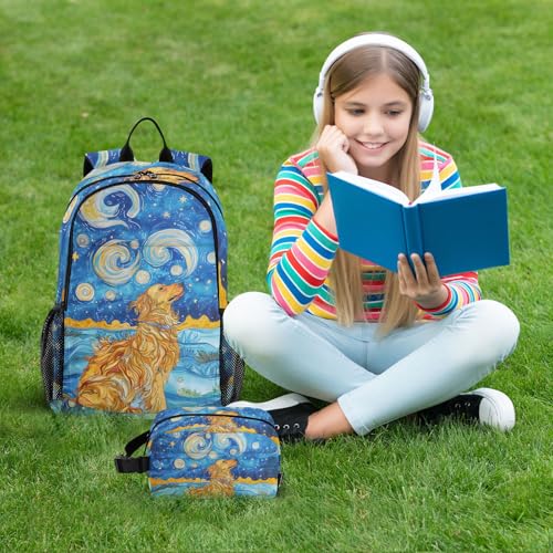 School Backpack and Insulated Lunch Bag Set Teens Girls Boys Kids Schoolbag Set Golden Retriever Starry Night Backpack 3