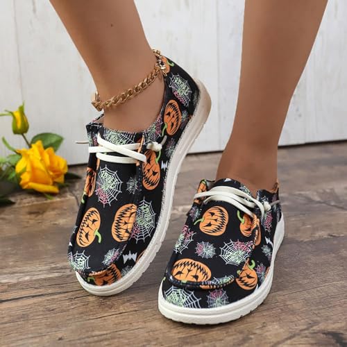 Women's Halloween Canvas Sneakers 2025,Skeleton Pumpkin Printed Low Top Lace up Walking Halloween Shoes Breathable snug,Casual Flat Slip-On Shoes Pumpkin