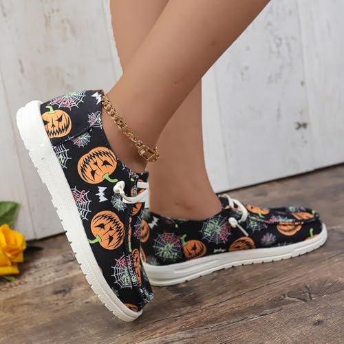 Women's Halloween Canvas Sneakers 2025,Skeleton Pumpkin Printed Low Top Lace up Walking Halloween Shoes Breathable Comfortable,Casual Flat Slip-On Shoes Pumpkin 5