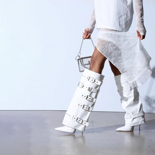 More information about White Knee High Boots Fold Over Stiletto High Heel Pointed Toe Shark Boots with Buckle Pull On Dress Biker Boot