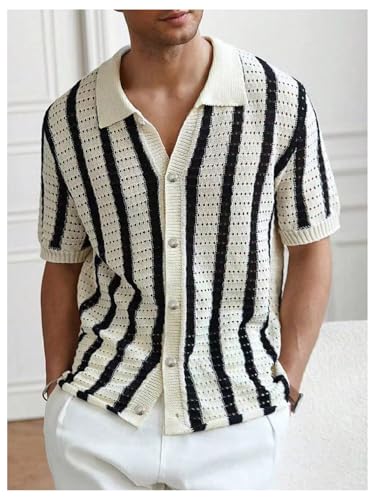 More information about WDIRARA Men's Big and Tall Striped Crochet Button Down Shirt Half Sleeve Collared Knit Tops