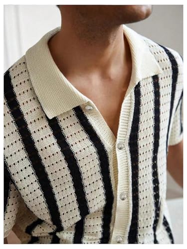 WDIRARA Men's Big and Tall Striped Crochet Button Down Shirt Half Sleeve Collared Knit Tops 6