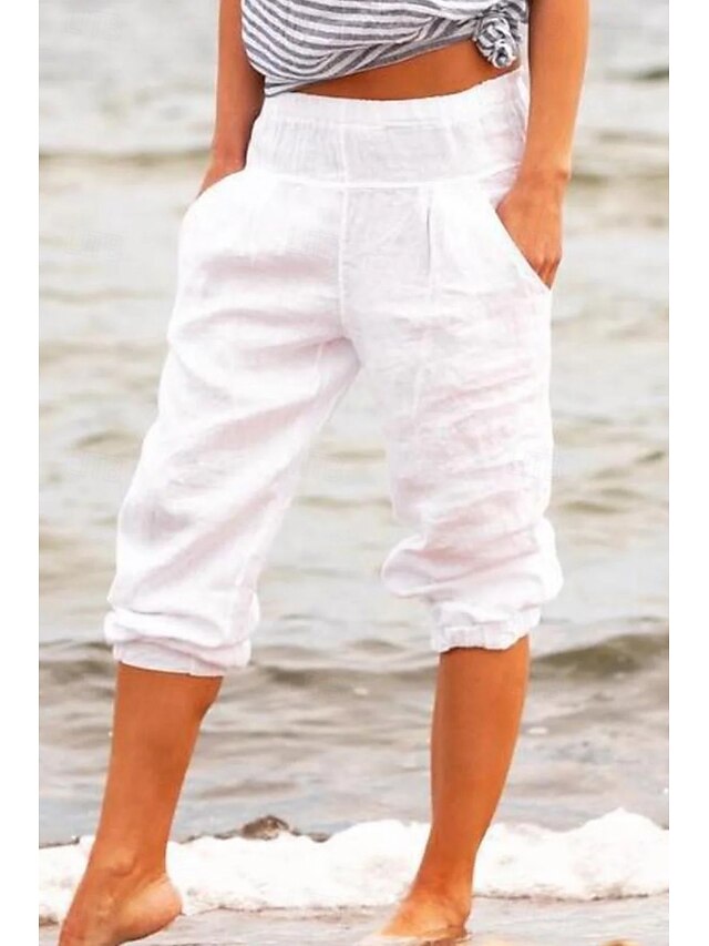 Women's Capri Pants Cotton Linen Pants Slacks Streetwear Casual Calf-Length Natural Plain Pocket Elastic Waist Comfy Outdoor Comfortable Street Daily Wear Going out Sapphire Black White Dark Gray 10