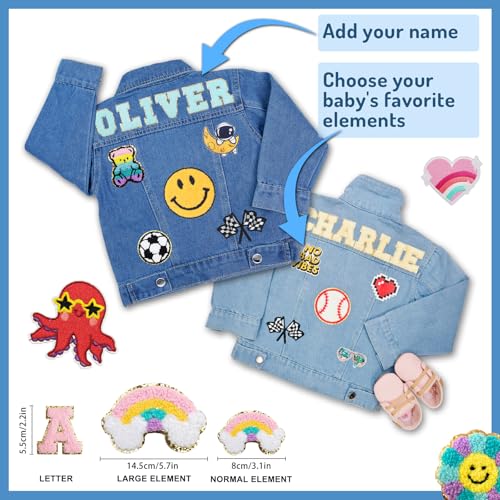 Fabric type: Cotton 72%, Polyester 27%, Spandex 1%Care instructions: Machine WashOrigin: Made in the USA or ImportedPersonalized Denim Jacket: This kid denim jacket can be customized with your child's name and pattern, of which there are more than 70 patterns in total, and up to 8 can be chosen. When children see their name and favorite pattern on the clothes, they will have a sense of belonging and pride.The Best Back to School Gifts: Kids love to share their one-of-a-kind items with their peers. A custom denim jacket can be a topic of conversation at school or events, helping your child build confidence and social connections. And of course, the perfect gift for your child on birthdays, baby shower, and Christmas.Material & Size: The denim jacket is divided into dark blue and light blue, made of superior denim fabric, which is very durable and comfortable, and can withstand frequent washing and wearing, while maintaining the shape and color of the clothing. This toddler denim jacket is perfect for children aged 1-8 years old, if your child is bigger than the same age, please choose 1-2 size bigger.Applicable Occasion: this kid denim jacket is perfect for fall, spring and early winter daily wear, school, parties, picnics and travel, and as a back to school outfit, and can be worn with a variety of undergarments inside, for casual occasions or slightly more formal events.Customized Services: Our denim jackets for girls and boys are personalized, high-quality, creative and emotionally valuable products that meet the needs of parents and children for uniqueness and practicality. If the product is not satisfactory, we will be responsible to the end. Perfect for everyday use. High quality materials and excellent craftsmanship ensure long-lasting durability.