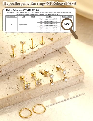Item display length: 7 millimetersItem width: 3 millimetersMaterial: Stainless SteelMetal type: Stainless SteelBack Finding: Push BackEarring design: StudBrief content visible, double tap to read full content. Full content visible, double tap to read brief content. Bundles with this item Previous page Surgical Steel Hypoallergenic Flat Back Earrings -6% $21.98 Was: $23.48 Next page See all bundlesEasy to Wear --Threadless Push in design,compared to traditional threaded Flat Back styles, you only need to move your fingers to put the ear piercing jewelry on and take off in one second. No more screw anything behind your ears,and you don’t have to worry about the threads scratching your sensitive skin.These nap flatback earrings offer convenience and comfort, ensuring a plush experience even during sleep, sports activities, daily activities,or showersHypoallergenic Flat Back Studs: These earrings studs Made Of 316L Stainless Steel,which is the ideal choice If you have sensitive skin.Our flat back stud earrings has passed The Anti-allergy Test,Waterproof Test.Nickel and lead-safe,non-irritating,The push in earrings stud with smooth polished surface,Surface electroplating 18K gold tone,safe and durable,never turn your skin green, designed to prevent irritation and discomfort for extended wear.Dainty Small earrings are lightweight,Even if you wear several earrings stacks together, won’t put any strain on the earThreadless Flat Back Earrings Set:1 order you will get 4 pairs push in flat back earrings studs ,2pcs 8mm hoops and 1pcs of straight piercing taper.Piercing Stud Gauge Size: 16G(1.2mm)/18G(1.0mm)/20G(0.8mm) Bar Length: 6mm/7mm/8mm,meet your different needs.Color: silver/18K gold Plated .AAAAAA+ cubic zirconia,which is staying securely set, Long-lasting shine.Dainty tiny stud earrings are suitable for most women and men.EACH POST FITS ALL THESE THREAD TOPMultiple Uses:Not only earrings studs, but also nose studs,These 16 gauge body piercing jewelry can be used as cartilage earring stud/helix earrings/daith conch piercing jewelry/tragus earrings for women,and lip rings stud / Labret medusa piercing jewelry.18 gauge and 20 gauge is more suitable for your nose piercing and most ear piercings,They can be worn in different parts of the ear.Wear it, whether it is usually or party, you will be the most shining focusMaintenance Tips: After removing the dainty earrings stud,Please place your small earrings in a lined jewelry box or a sealed plastic bag.Prevent Flat Back Earrings Studs from being scratched and lost. LOLIAS - Focus on your Fashion Jewelry Perfect for everyday use. excellent materials and excellent craftsmanship ensure long-lasting durability.