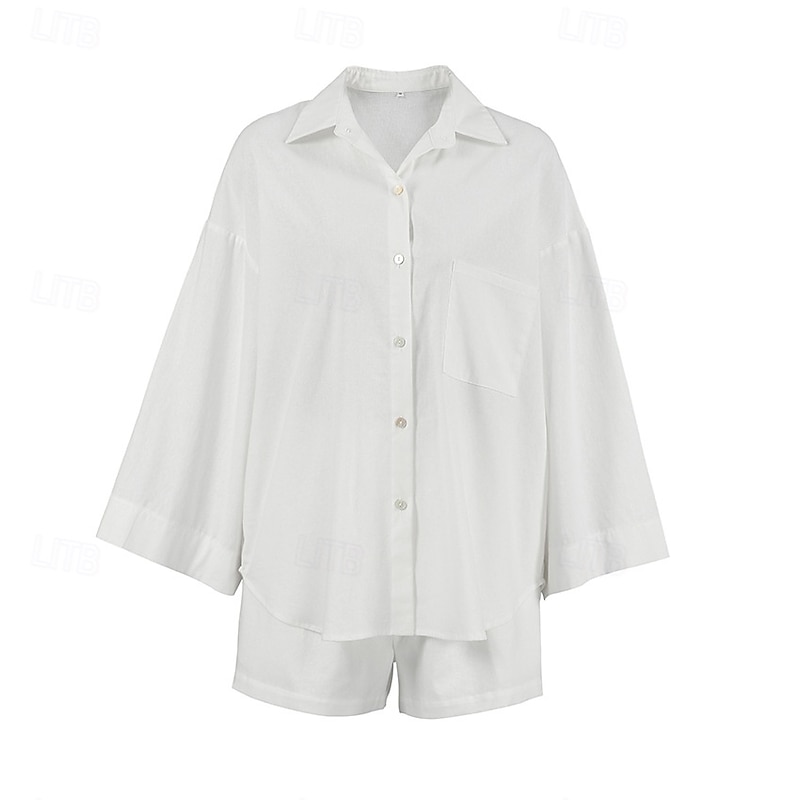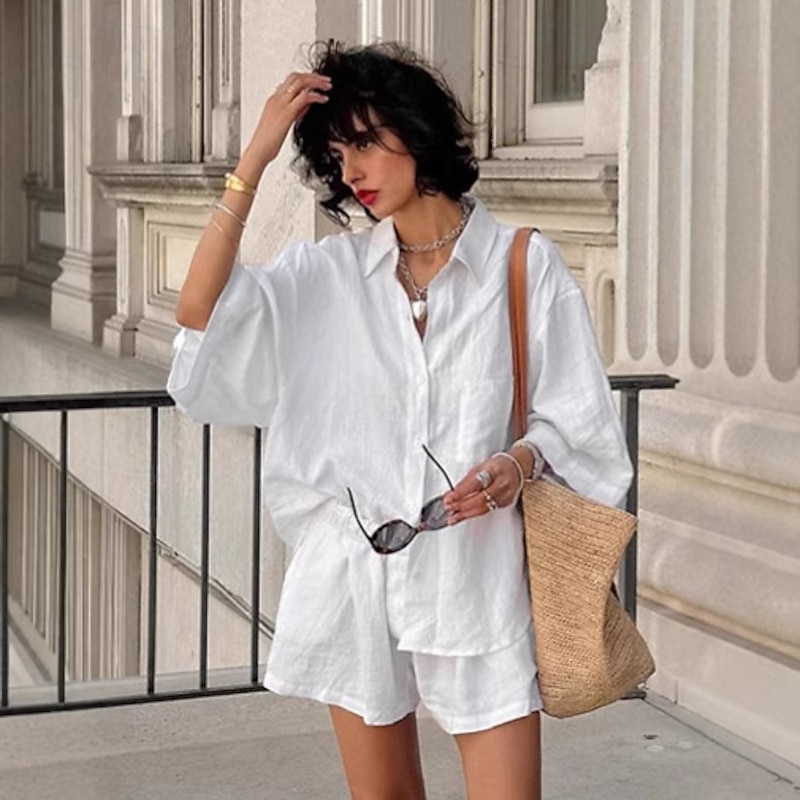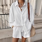 Women 100% Cotton Elegant Vacation Vintage Shorts Sets Long Sleeve Shirt Collar Plain Vacation Casual Daily White Summer