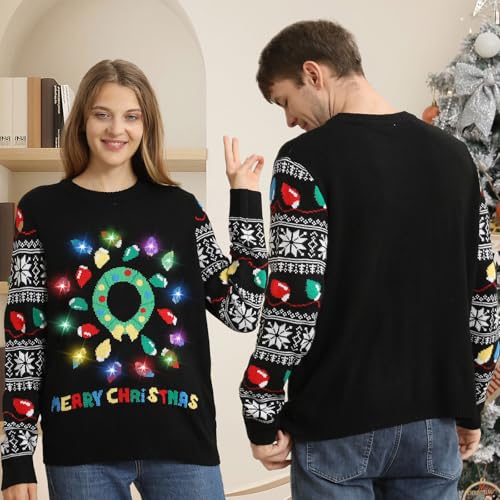 • 【Christmas wreath design】Ugly christmas sweaters for women 2025 with a special circle light pattern cleverly simulates the enduring elements of the Christmas wreath, which means reunion, peace and hope, each colorful string of lights are sparkling with the light of the holiday, adding a warmth and joy for the wearer. The novelty and chic design of the funny christmas sweater has become an indispensable fashion item during the Christmas season