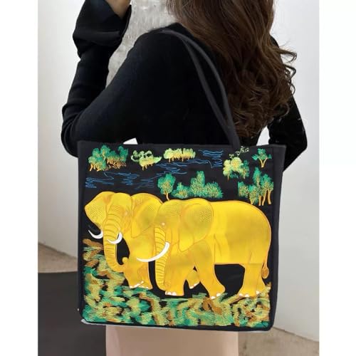 sought-after ! Embroidered Elephant Tote Bag with Jungle Scene, Black
