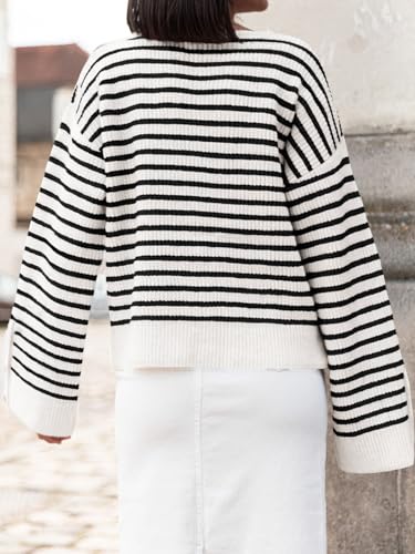 Saodimallsu Womens Striped Sweater Oversized V Neck Knit Long Sleeve Drop Shoulder Trendy Loose Pullover Sweaters