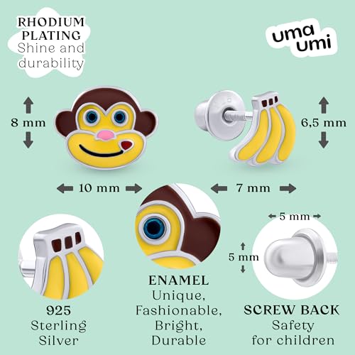 925 Sterling Silver Monkey & Bananas Stud Earrings for Girls Hypoallergenic Safety Screw Back Rhodium Plated - Monkey & Bananas Gifts Earrings for Baby Toddlers Little Teens Kids Earrings Jewelry 6