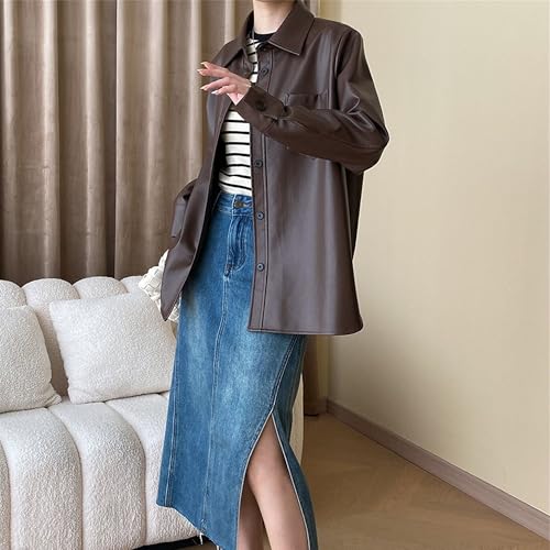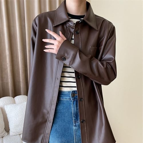 JEKE-DG Women's Button Down Loose Fit Outdoor Coat timeless Faux Leather Coat Jacket Lapel Lonf Sleeve Solid Outerwear