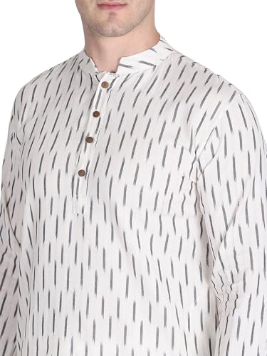 Men's Cotton Handloom Kurta Long Ikat Khadi Kurta Mandarin Collar Full Sleeves Side Split Indian Tunic Ethnic Wear for Wedding Party - Medium (White)