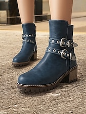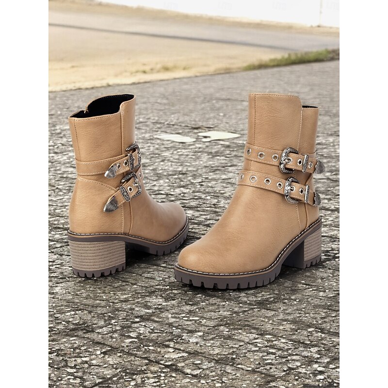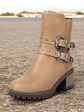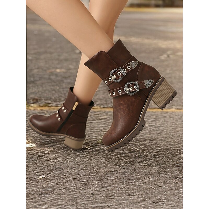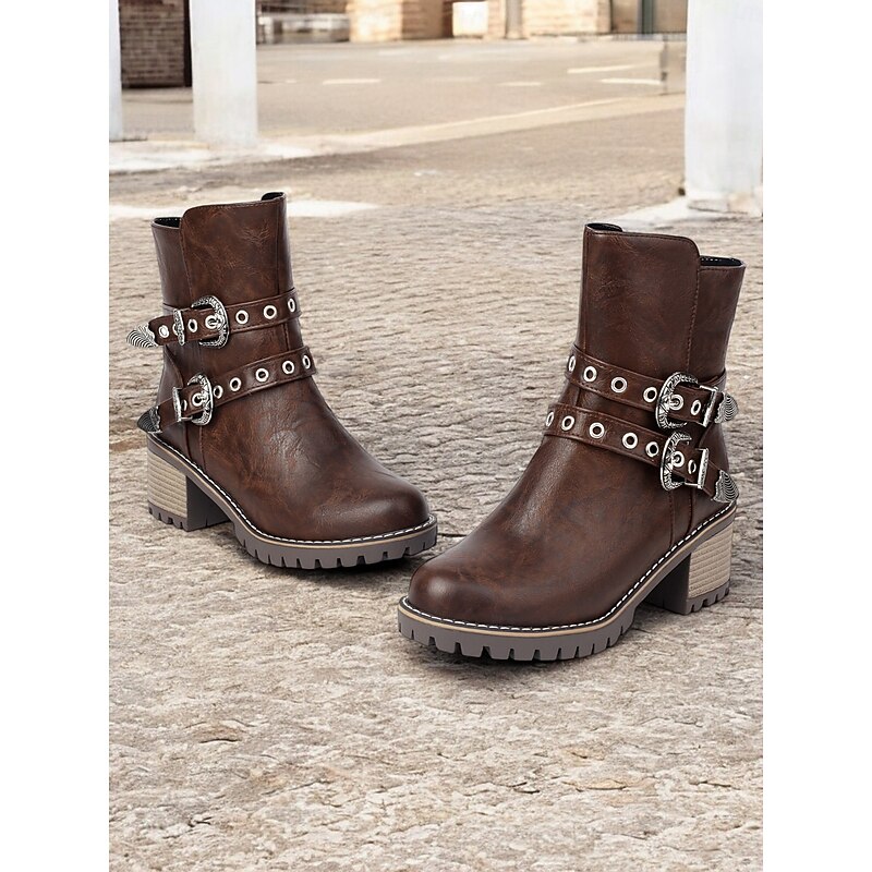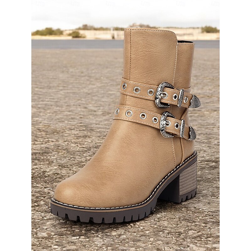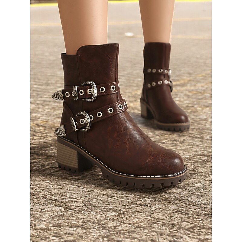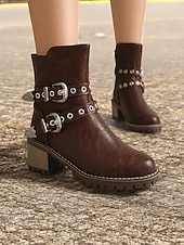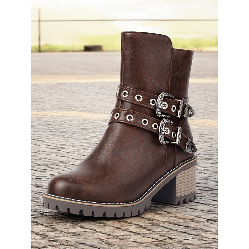 Highlights [Fabric] : Crafted from high-quality PU leather, these women's ankle boots offer a refined look with the durability you need for day-long wear. Lined with supple textile, they ensure comfort as you step out in style. [Fit] : Featuring a round toe and a chunky heel design, these boots offer both contemporary style and practicality, providing a stable fit that’s faultless for various occasions. With a shaft circumference ranging from 10 to 12 inches, they provide ample coverage. [Design Highlights] : These boots stand out with their Western-inspired aesthetic, adorned with decorative metal buckles and rivet embellishments. The double buckle straps add a rugged charm, while the side zipper ensures easy wearability and a secure fit. [Occasions] : Perfectly suited for everyday wear, work settings, and casual outings, these boots can be effortlessly paired with jeans, skirts, or dresses. Whether you're headed to the office or a weekend gathering, they adapt to various occasions with ease. [Size Notice] : Available in a range of sizes from US5.5 to US10.5, we recommend selecting your usual size for the best fit. Please refer to the size chart provided by the supplier to ensure an optimal selection.
