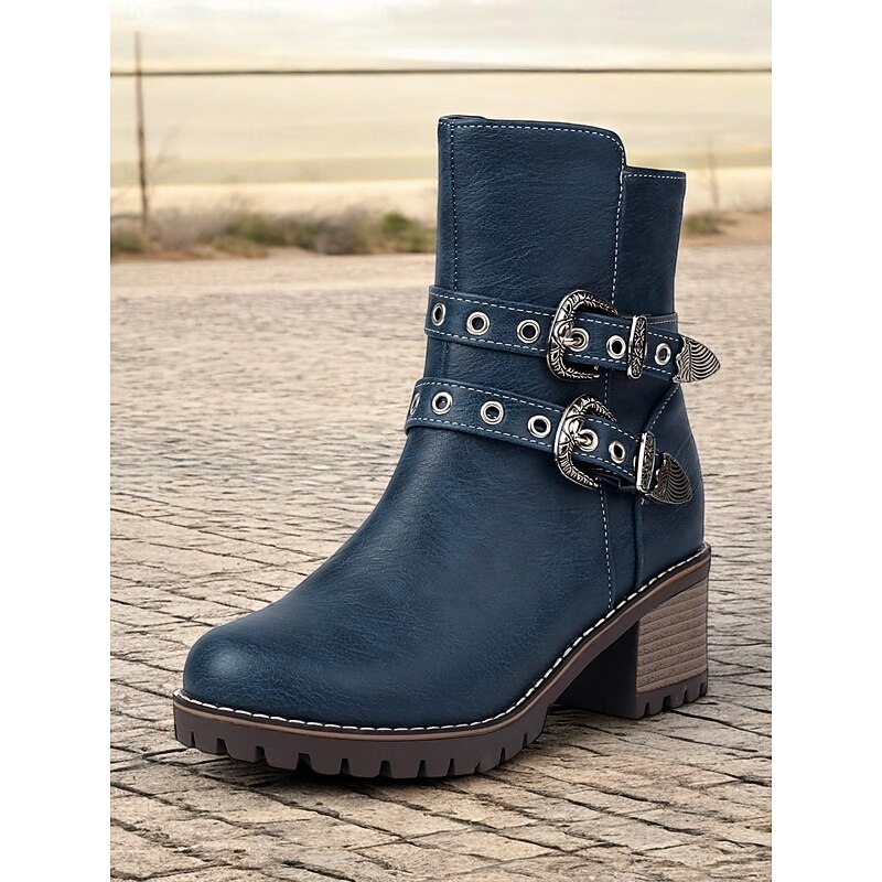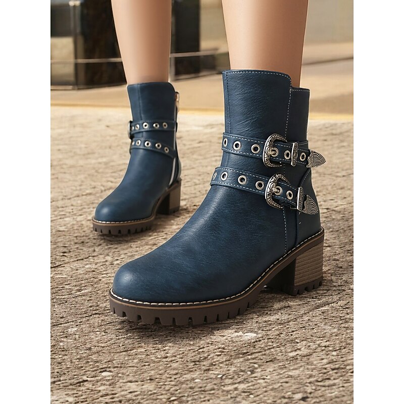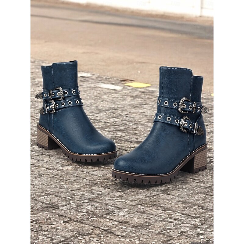 sought-after ! Women's Blue Ankle Boots with Double Buckle Straps and Chunky Heel – Western-Inspired Design with Metal Stud Accents for Casual and Rugged Looks