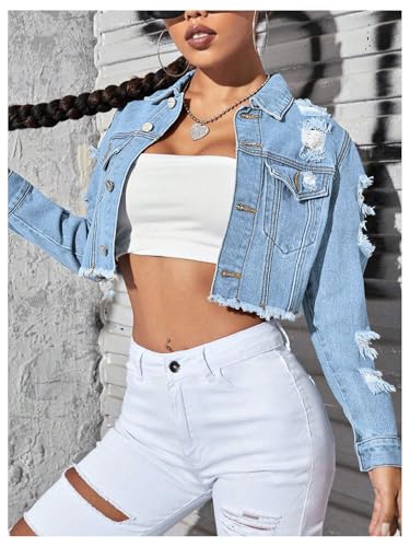 OYOANGLE Women's Ripped Cropped Denim Jacket Long Sleeve Distressed Raw Hem Button Up Coats